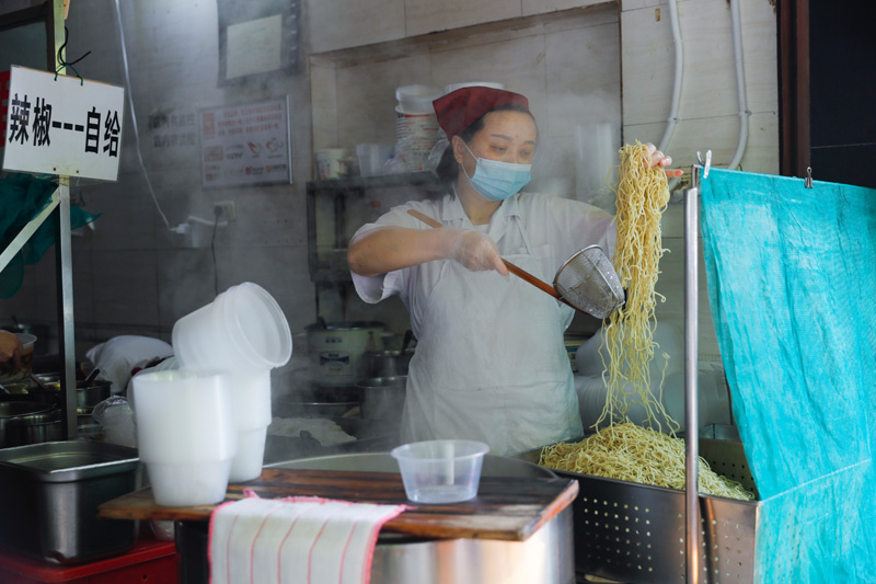 4月22日,武汉市粮道街的家阳"赵师傅"天天红油热干面店厨师在制作热干面。新华社记者 沈伯韩 摄
