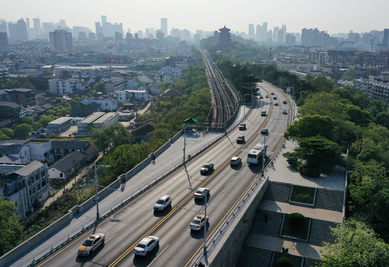 4月15日在早高峰时段拍摄的武汉长江大桥(无人机照片)。新华社记者 李贺 摄