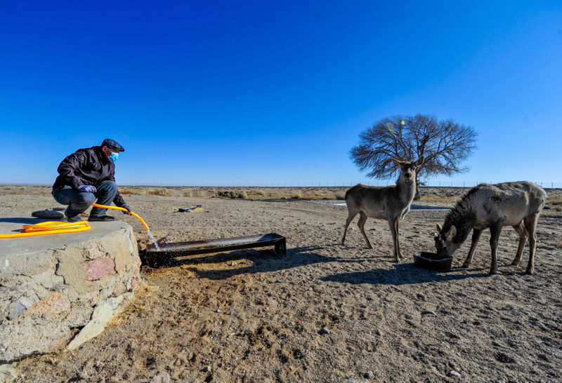 3月13日,在内蒙古锡林郭勒盟苏尼特右旗额仁淖尔苏木的野生动植物救助站,管护员特古斯在饲喂马鹿。新华社记者 连振 摄
