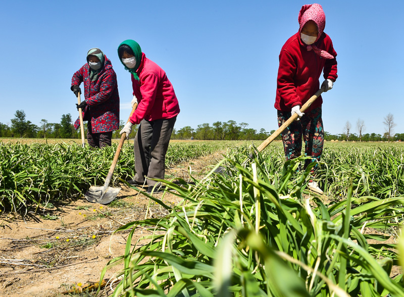5月11日,农民在山西省大同市云州区西坪镇唐家堡村边的黄花菜地里除草。新华社发(柴婷 摄)