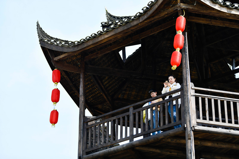 游客在重庆市武隆区黄莺乡复兴村的观景楼上欣赏田园景色(2019年3月28日摄)。新华社记者 刘潺 摄