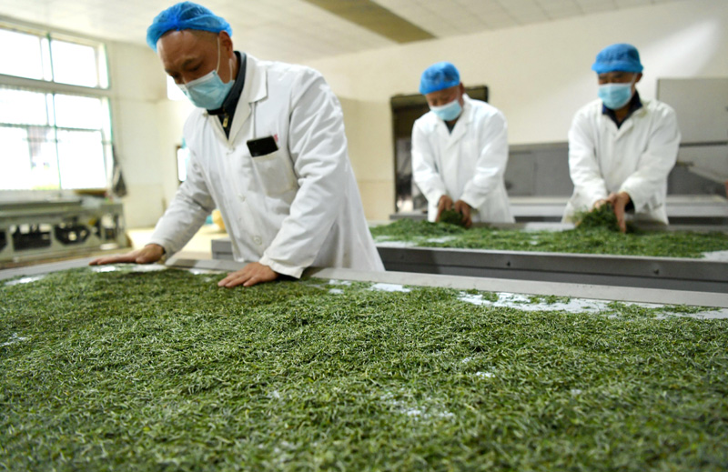 3月13日,在位于湖北省恩施土家族苗族自治州宣恩县万寨乡板场村的伍家台富硒贡茶公司,制茶师在按照传统工艺制作手工茶。新华社发(宋文 摄)