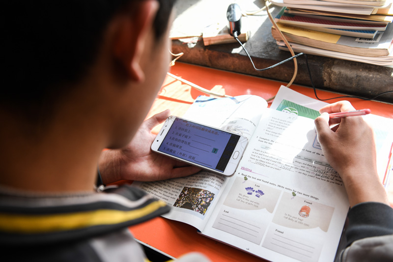 3月10日,内蒙古准格尔旗龙口镇红树梁村的初一学生刘进才在家中上网课。新华社记者 刘磊 摄