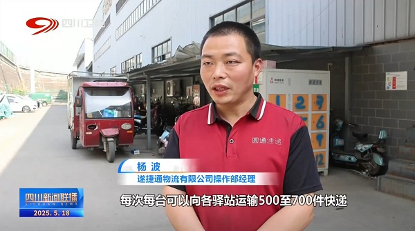 遂捷通物流有限公司操作部经理杨波:每天每台可以发车6至8次,每次每台可以向各驿站运输500至700件快递。比传统运输派送方式效率可以提高2到3倍。