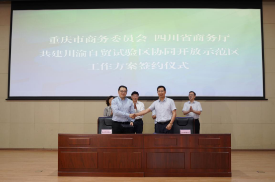 会上,四川省商务厅与重庆市商务委签署了《共建内陆改革开放高地战略合作协议》《推动成渝地区双城经济圈建设商务工作机制》《共建川渝自贸试验区协同开放示范区工作方案》三个文件。根据协议,川渝两地商务部门,将加强统一谋划、一体部署、相互协作、共同实施,着力推动商务领域改革协同、开放协同、产业协同、市场协同、民生协同,全面提升要素和市场活力,共同创建具有时代特征、区域特色的内陆改革开放高地,共同把川渝自贸试验区打造成为具有国际水准、中国特色、巴蜀底蕴的内陆开放示范窗口,为成渝地区双城经济圈建设作出积极贡献。