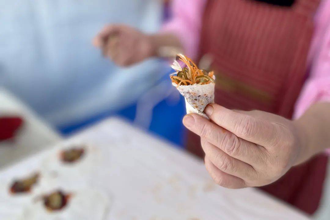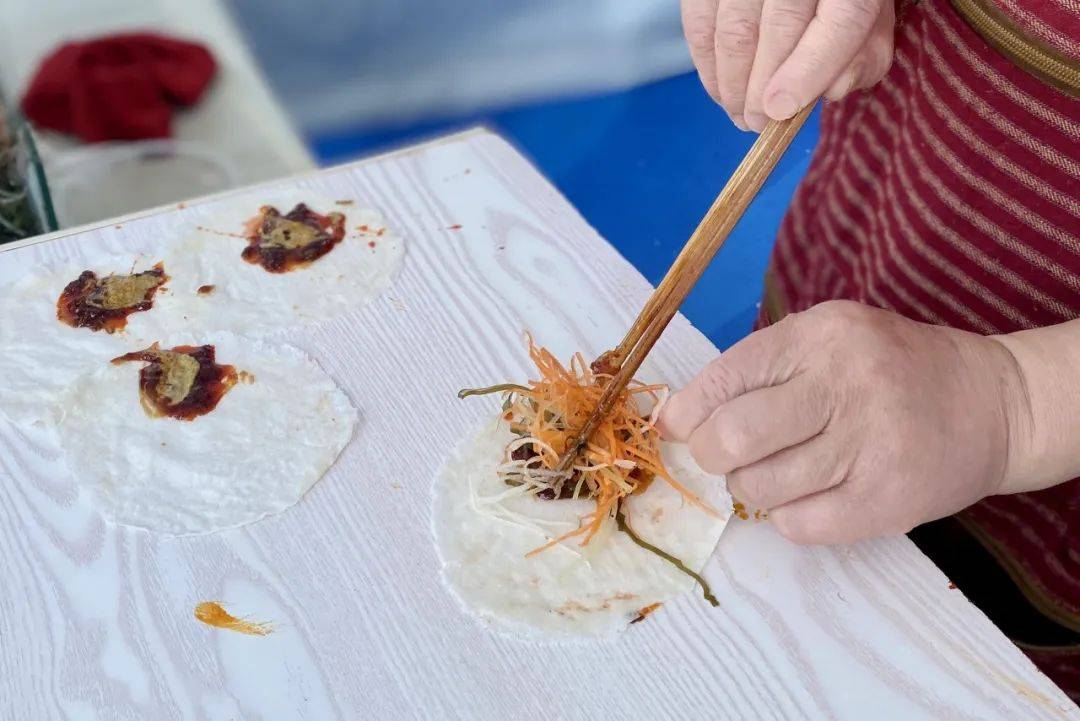 “冲”是将一张张很薄的面皮摊开,放上黄芥末、辣椒、豆瓣酱,加上萝卜丝、莴笋丝、海带丝,裹好后再挤上甜醋或者酸醋,顺势放进嘴里,辛辣刺激的口感直接带动鼻腔至全身通透,遂宁人亲切地用方言称它为“冲”。